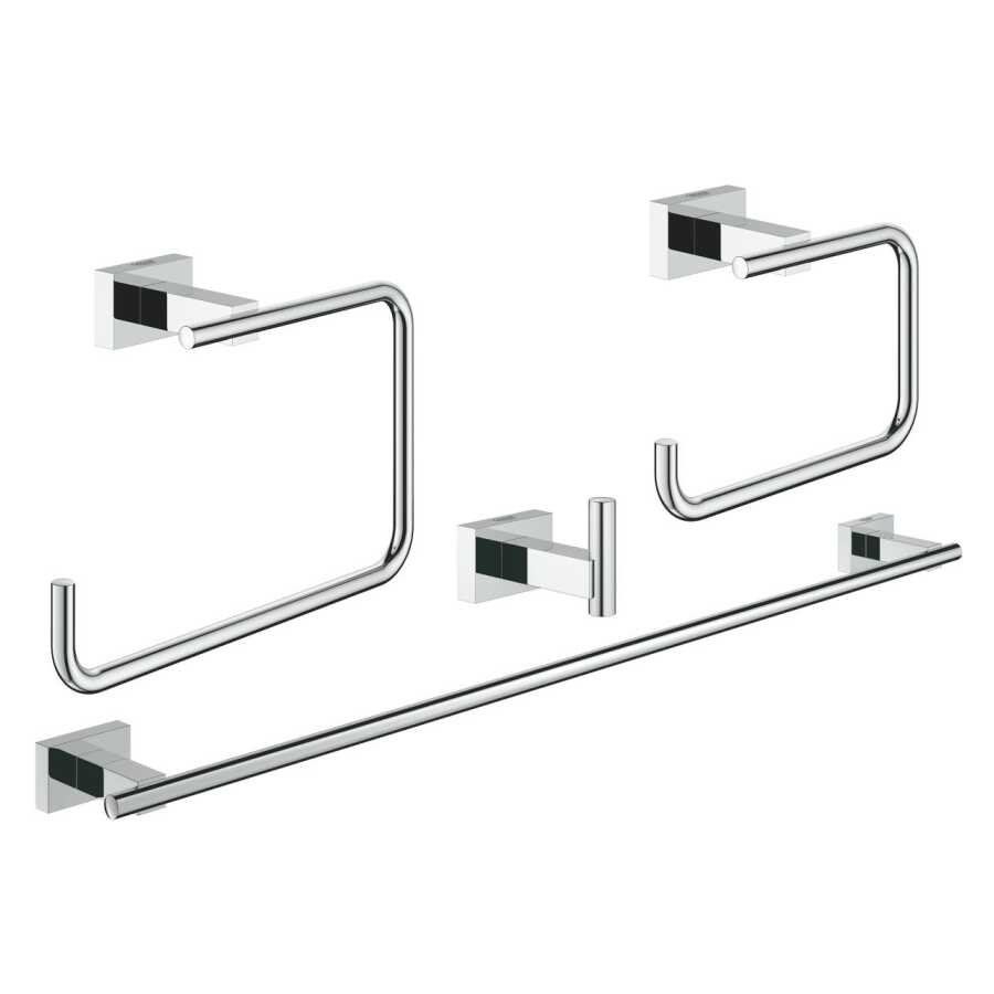 Keskin hatlı aksesuarlardan oluşan eksiksiz bir setle banyonuza şık ve mükemmel bir görünüm kazandırın. 4'ü 1 arada GROHE Essentials Cube aksesuar seti şık ve konforlu tasarımınızı tamamlamak için ihtiyacınız olan tüm önemli parçalara sahiptir. Setin içinde bir adet halka havluluk, 600 mm genişliğindeki havluluk, havlu/bornoz askılığı ve tuvalet kağıtlığı bulunur. Göz alıcı ve dayanıklı GROHE StarLight krom kaplama ile kaplanan set, banyonuzu tamamlamak için ihtiyaç duyduğunuz her şeye sahiptir. Tüm uyumlu parçalar, görsel açıdan uyum yakalayacak ve üstün bir performans sunacak şekilde tasarlanmıştır.
